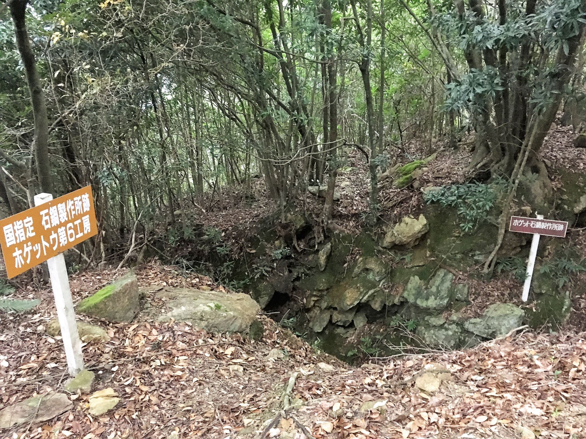GZ近くで「案内看板」(「石鍋製作所跡 ホゲットウ第6工房」or「ホゲットウ石鍋製作所跡」)とあなた、またはあなたのGPS機器の写真を撮り、ログにアップロードしてください。但し、滑石壁面は写さないでください。