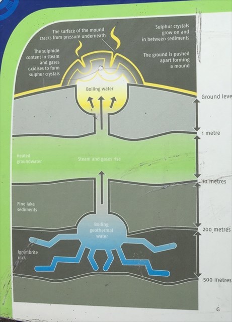 The yellow and black colours in the rocks of this area are sulphur crystals formed from rising hydrogen sulphide gas that also causes the distinctive smell. Black crystals are formed under hotter temperatures 112degC, yellow crystals at slightly less 98degC.