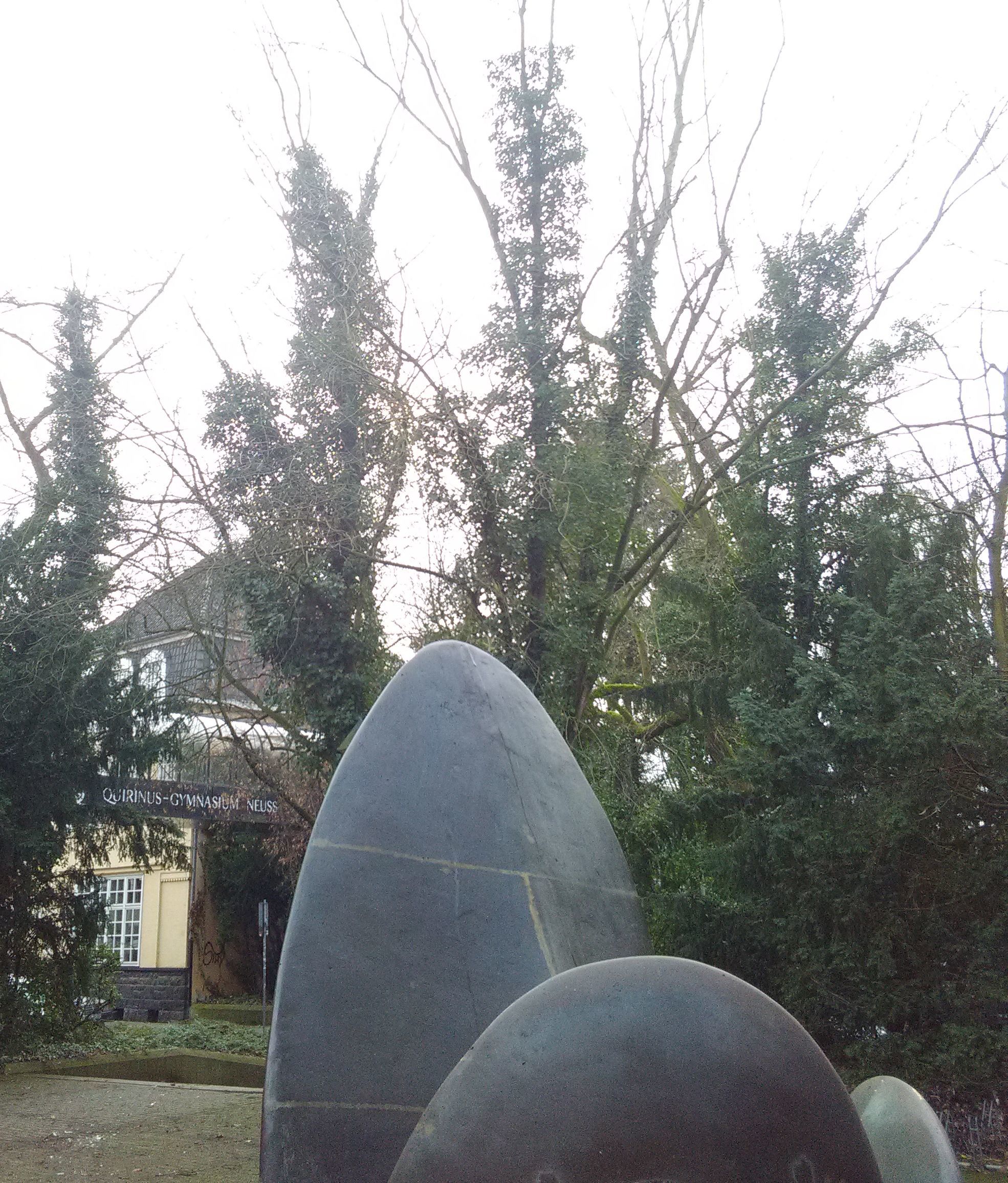 Hier findet ihr eine Bronzeskulptur ohne Titel von Ladis Schwartz aus dem Jahr 1979. Im selben Jahr zog das Quirinus Gymnasium, damals noch eine reine Jungenschule, von der Breitestraße (heutiges Amtsgericht) hier an diesen Standort. Im Hintergrund das alte "Kolpinghaus" und die Brücke des Gymnasiums.