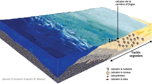 A l'époque, la région était recouverte par la mer tandis que les Pyrénées, les Alpes et les massifs provençaux n'existaient pas encore. Quatre types de calcaires correspondant à des profondeurs de moins en moins importantes caractérisent la série urgonienne : les calcaires à silex, les calcarénites, les calcaires à coraux et les calcaires à rudistes (profondeur inférieure à 10 mètres). Outre les rudistes, ces calcaires contiennent une faune très riche : autres bivalves, gastéropodes, coraux, céphalopodes, oursins, brachiopodes...