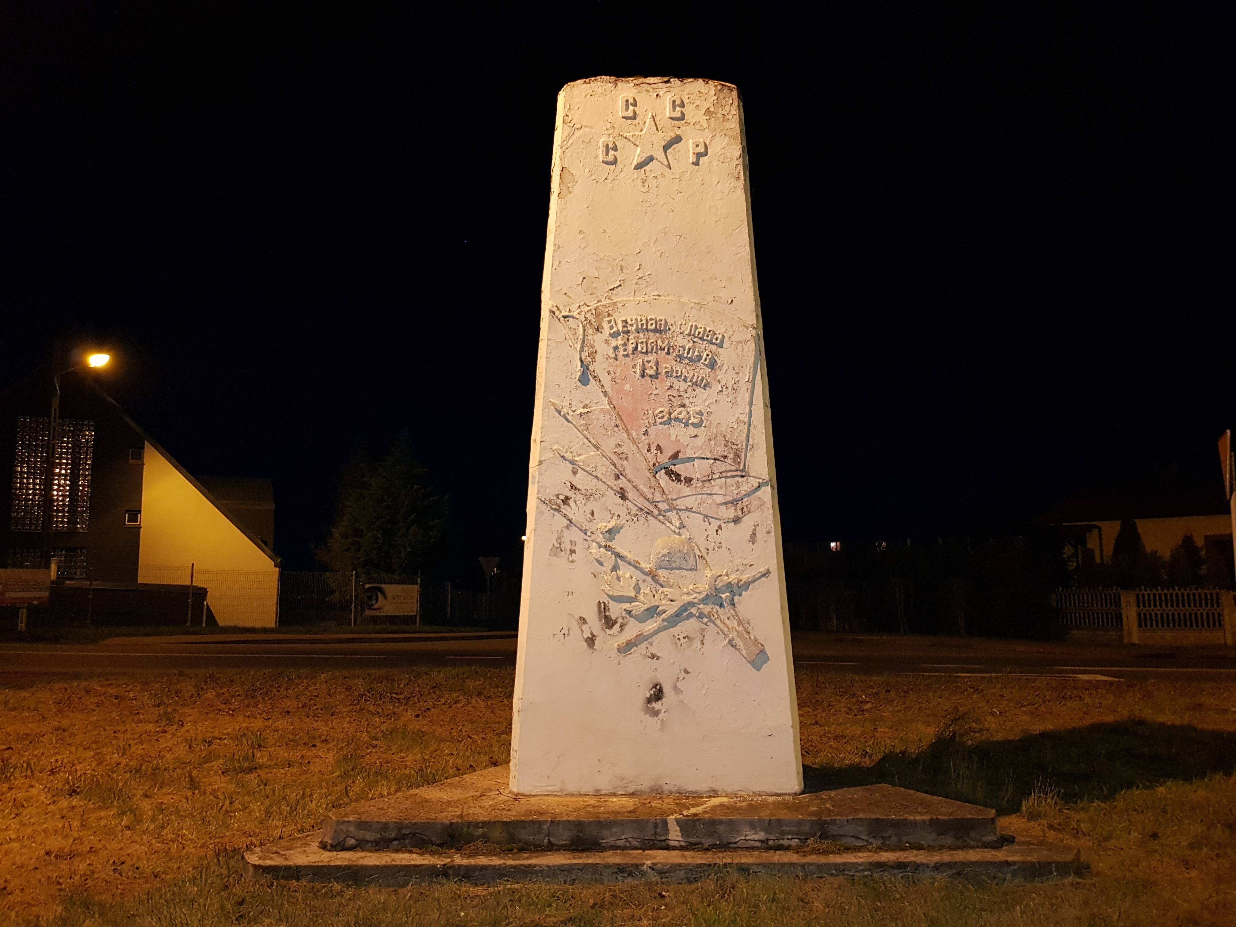 It's certainly one of the last statues like this in Poland. On the old and damaged monument we can see an russian sentence "Вечная слава героям войн 13 армии 1945" which means "Eternal Glory for the heroes of war from the 13. army - 1945" above we can se the red star (which is painted white not to disturb young people) with the writing CCCP (United Soviet Socialist Republic). It's a symbol of the past times, probably in the near future it will be destroyes according to the new decommunization law in Poland (which changed a lot of street names for example. Hanka Sawicka, Karol Świerczewski, Ludwik Waryński and Julian Marchlewski) and destroyed plenty of statues from the past.