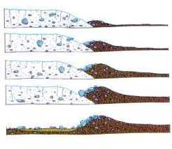 - 1. The rock fragments carried by the ice are piled up along the ice front in much the same manner as a conveyor belt carries along material and dumps it at the end of the belt. Minor advances of the ice front may rearrange the debris to form a larger and higher moraine.