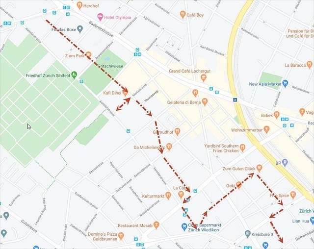 Kreis 3, N 47° 22.675 E 008° 30.543 Vom Albisriederplatz zur Zweierstrasse, ergibt die N 47° 2X.XXX