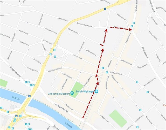 Am einfachsten gehst du zurück zur Kalkbreitenstrasse und nimmst den 32er-Bus bis Röntgenstrasse.