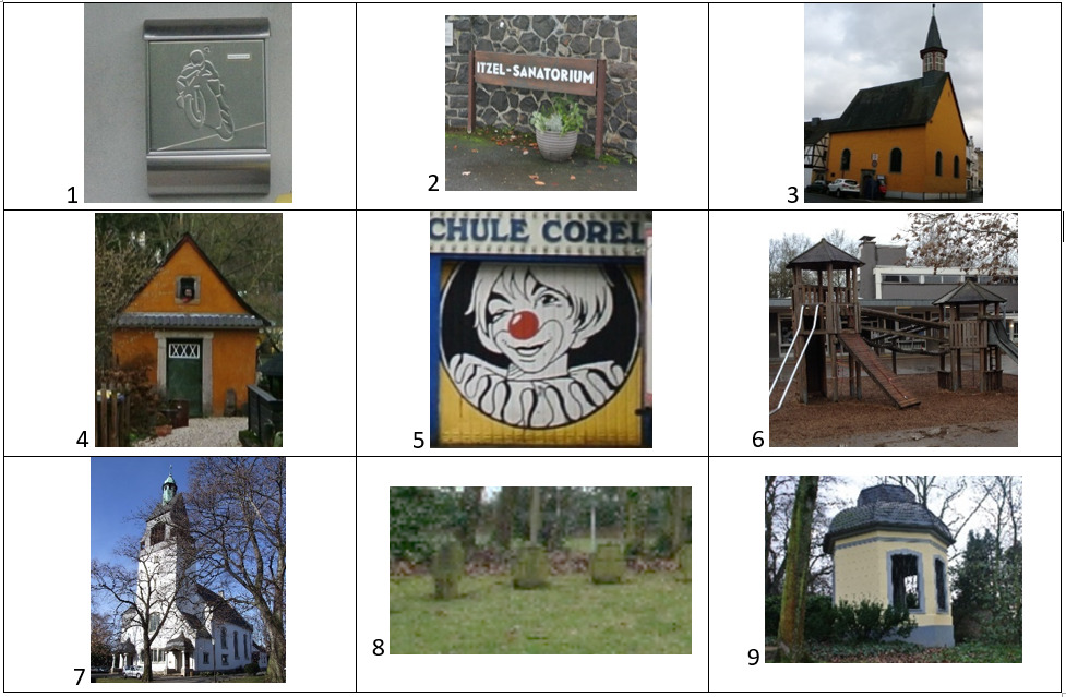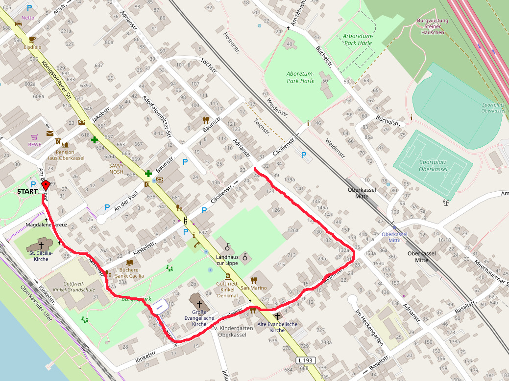 Der Rundgang startet am Parkplatz „Am Buschhof“ (Anschrift für’s Navi: Am Buschhof 34; 53227 Bonn), ehemals Friedensplatz, Standort der Kirmes und heute Ort der Oberkasseler Abenteuertage und des Weihnachtsmarktes. Haltet ab Start die Augen offen. Findet die Orte, die auf den Bildern gezeigt werden, dann ist die Beantwortung der Fragen ganz einfach. Die Bilder sind durcheinandergeraten – sie sind nicht in der Reihenfolge, in der sie am Weg (siehe unten) zu erkennen sind. Die Rätsel sind für Grundschulkinder ab 2. Klasse lösbar. Für die Zielkoordination braucht's evtl. noch Hilfe von älteren Geocachern. Da der Weg mindestens eine sehr belebte Straße quert, ist der Cache für Kinder ohne Begleitpersonen ggf. nicht geeignet. Beim Test haben wir 50 Minuten vom Start bis zu den Zielkoordinaten gebraucht.
