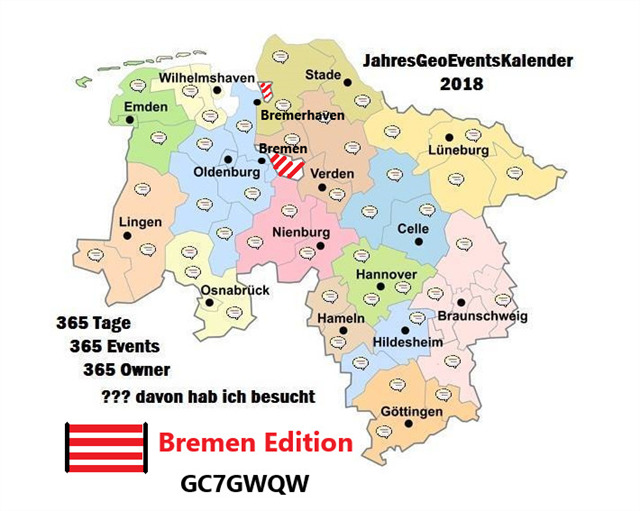 Das ist ein Teil der verrückten Idee von lavette96 ,der diesen JahresGeoEventKalender 2018 ins Leben gerufen hat. Hierbei soll es an jedem Tag des Jahres 2018 ein Event in Niedersachsen geben.