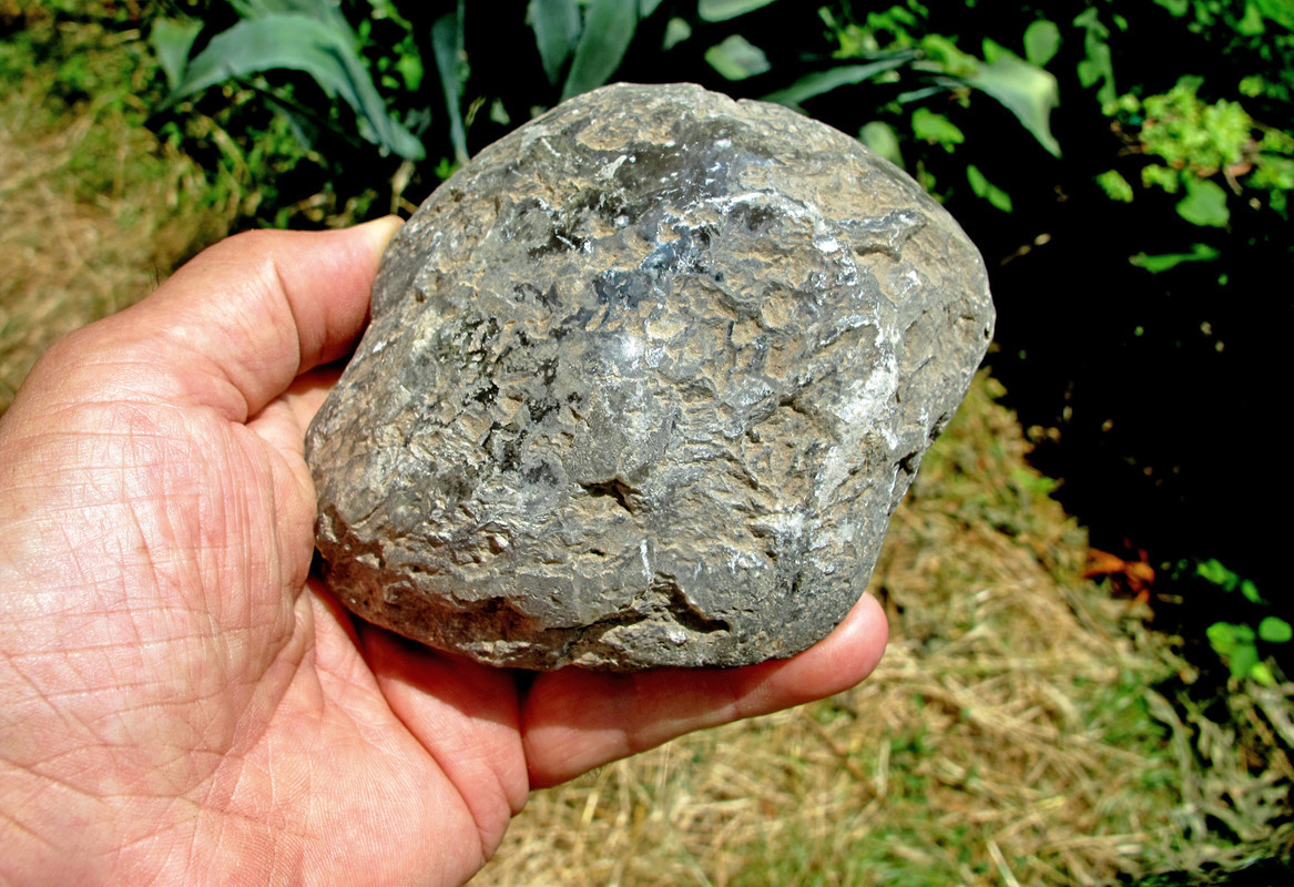 The phosphoric stone is a particular type of baryte (or barium sulfate), also called barytine. It comes in the form of fibrous-rayed nodules, a unique conformation for the baryte, of greyish-white color and of pearly luster. Another characteristic of this stone is its high specific weight (so much so that it was initially called "heavy spatum"), which distinguishes it from similar-looking minerals, such as gypsum and calcite, which are also present in the clay soils of the badlands of Mount Paderno. Its particular chemical composition also shows the presence of traces of metals, including copper, which are thought to be responsible for the phosphorescence.