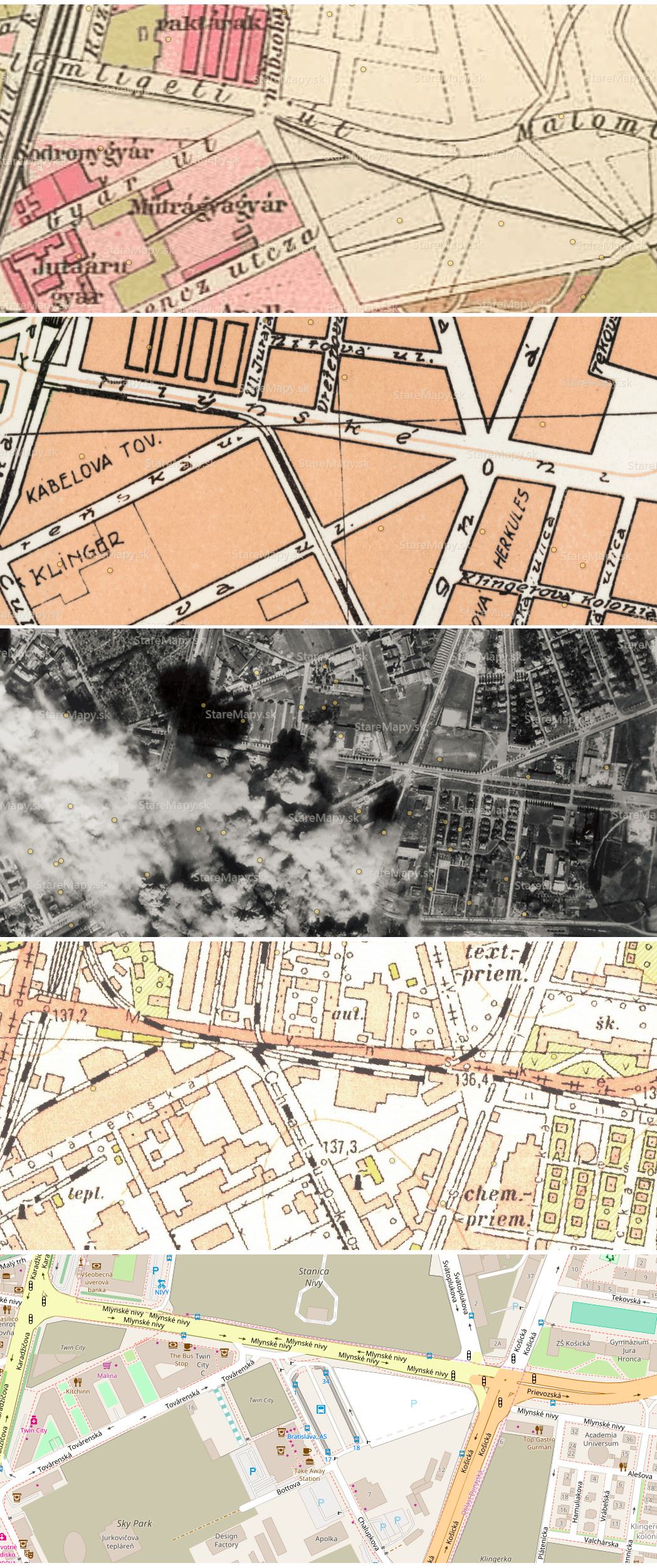 Premeny okolia stanice Mlynské Nivy (1910, 1931, 1944, 1964, 2018):