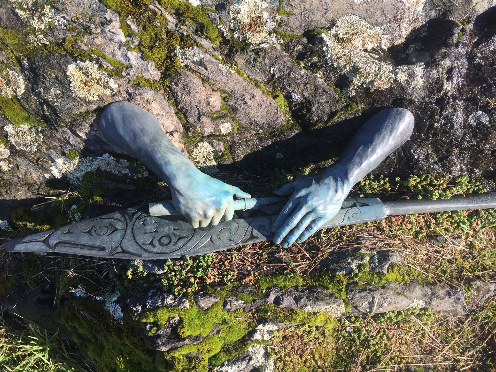 The sculptures are: "Carving a canoe paddle" (below), "Holding a railway spike", "Performing with a fan", "Carrying Point blankets", "Carrying books", "Holding binoculars", "Tying a rope to a mooring", "Panning for gold", "Raising a tea cup", "Holding a mirror", "Cupping Dogwood blossoms", and "Digging Camus". (Note: sadly "Digging Camas" has already been vandalized.) The three-dimensional hands vary in culture, age and gender, and silently convey eras and stories of Victoria. I hope you will enjoy finding the sculptures as much as I did.