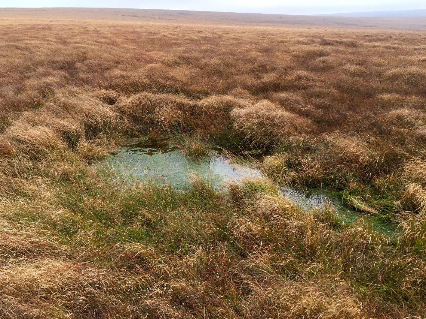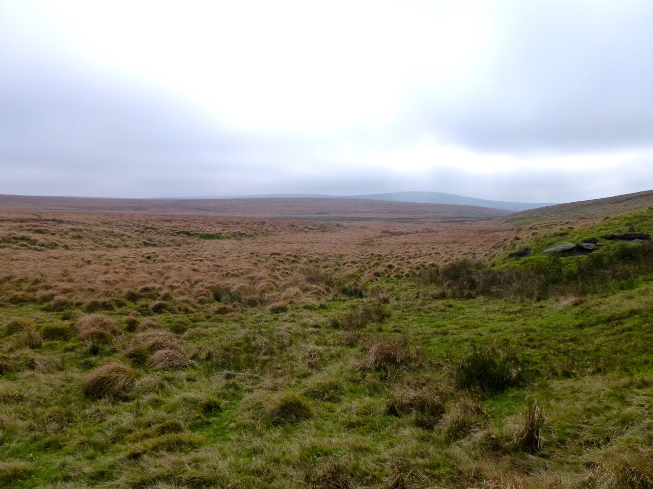 The Brim Brook is a tributary of the West Okement River and as such is in one of the most remote areas of the north moor of Dartmoor. As with most Dartmoor rivers, it is not easy to locate its exact head, which will vary considerably with the time of year and the amount of rainfall. The cache is located near to the head of one arm of the brook, but the other arm is fed from numerous bog pools further up the valley, see photo.