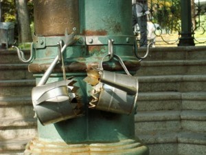 Regarding the structure that shelters this font, originally it was not such. It was a red water lagoon that served to irrigate the gardens. In 1609 it was a wooden casket fortified with another of stone and lime. In 1733 the casket was enclosed in a kind of solid temple, in which a door was placed. In 1827 the aforementioned casket was covered with a wooden cover lined with iron, thus leaving the Font perfectly closed. During 1878 the first major works of the Fuente Agria are projected. The structure would be one piece on a hexagon (later an octagon) with four steps (currently 9). The current structure or temple that we can observe today dates from 1905, being restored in 1920. Typical were the jugs of wáter: with them visitors could taste the water of this fountain with its edges full of tips to force the thirsty to drink the water by the jug's spout.