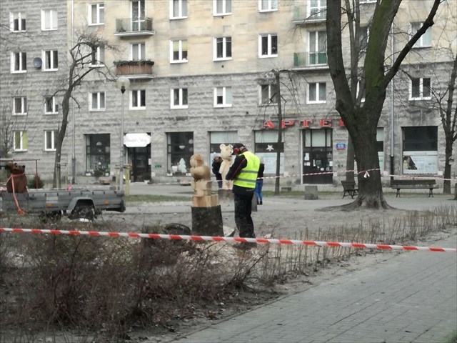 Na środku Placu Baśniowego na Ochocie do niedawna rosło kilka wysokich, spróchniałych drzew, zagrażających życiu mieszkańców oraz dzieci bawiących się na pobliskim placu zabaw. Na początku stycznia 2018 roku mieszkańcy wpadli na pomysł: oczywiście drzewa należy ściąć, ale czy koniecznie do końca? Na ich miejscu mogą stać figury z drewna - w końcu to Plac Baśniowy :) I tak się właśnie stało, z inicjatywy pani Barbary Laszczkowskiej z Ochockiej Wspólnoty Samorządowej.