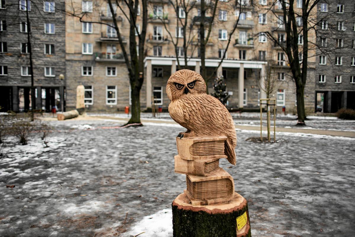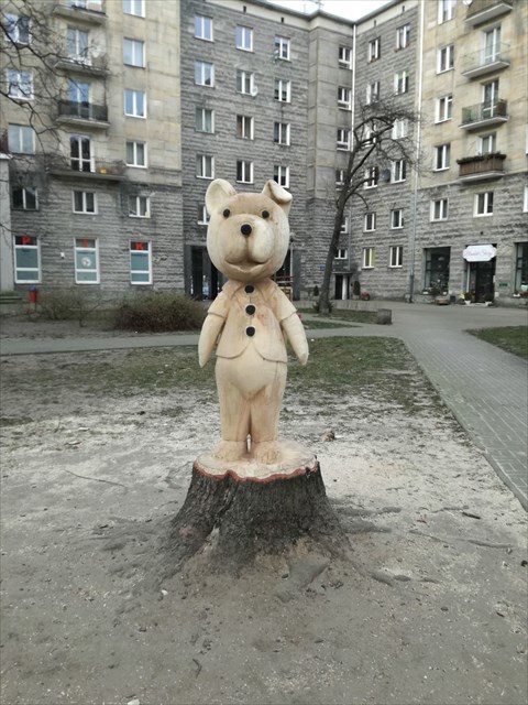 In January 2018, a group of Ochota (one of the districts of Warsaw) residents came up with an idea of sculpting few wooden figures. An owl, a mushroom, and, the most famous of them all, Miś Uszatek (Bear with a Droopy Ear, from an old Polish cartoon) stand at Plac Baśniowy (Fairytale Square) in Warsaw.