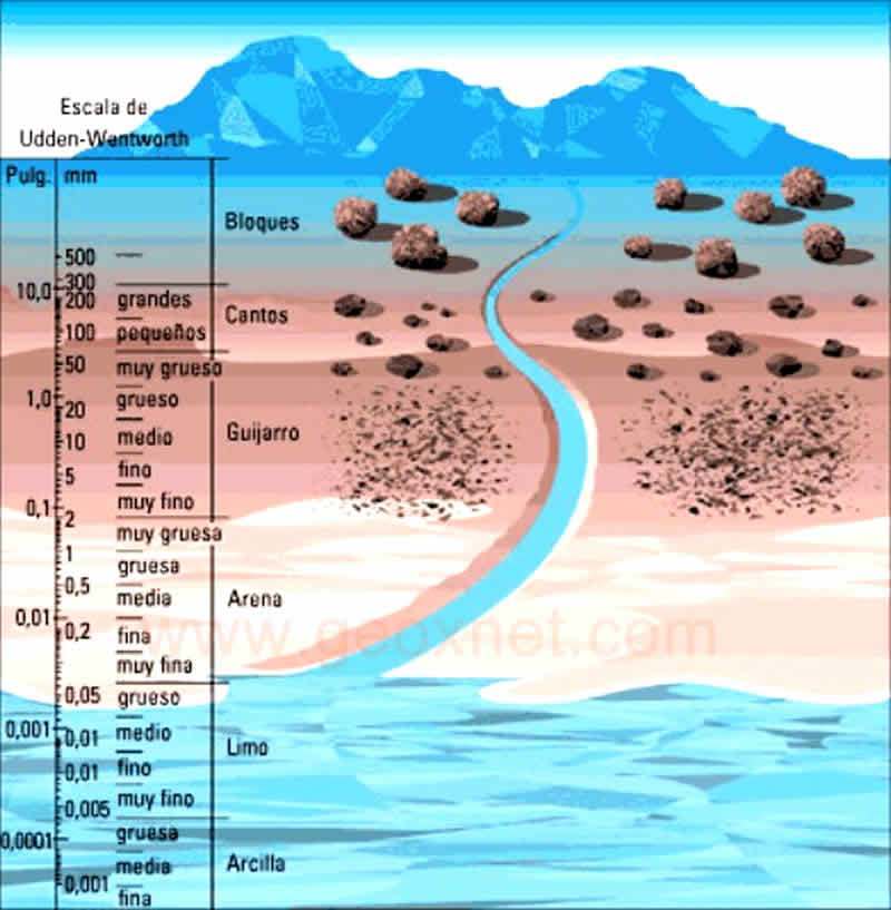 O tamanho de um grão, clasto ou partícula, nem sempre fácil de determinar quando são irregulares, geralmente é definido como o diâmetro de uma esfera do mesmo volume e é expresso em milímetros. Nos cantos de maior tamanho, a média das três medidas ortogonais máximas geralmente é realizada, embora não sejam cortadas no mesmo ponto.