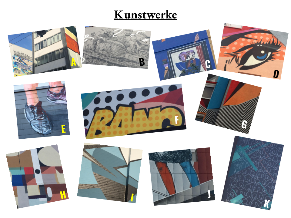 Besuch die Kunstwerke, stell dich mit dem Rücken zu ihnen und ordne den Kunstwerken A-K die Zahl des jeweils zu sehenden Suchobjekts zu. Zwei der Kunstwerke liegen so nah beieinander, dass sie eine gemeinsame Station bilden (Buchstabe A), daher gibt es auch nur 11 Stationen, insgesamt aber 12 Kunstwerke zu bewundern.
