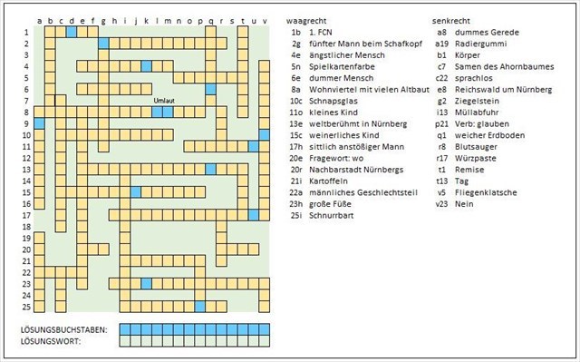 Nachdem es keinen fränkischen Duden gibt, ist die Schreibweise der Wörter nicht eindeutig geregelt. Ich habe mich überwiegend am Wörterbuch von Herbert Maas orientiert. Bei den für die Lösung notwendigen Buchstaben sollte aber kein Zweifel bestehen.