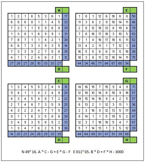 Die Summe der Zahlen in jeder Zeile und jeder Spalte muss gleich der Zahl im Ergebnisfeld (blau) sein. Streiche also alle 'überflüssigen' Zahlen. Am Ende addiere die beiden großen Diagonalen (Ergebnis in die grünen Felder eintragen) und berechne die Final-Koordinaten.