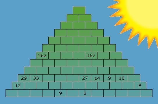 Für alle, die nicht auf die Lösung gekommen sind; die unterste Zeile in der Pyramide lautet: 3 9 8 8 9 9 8 2 2 3 2 6 und ganz oben steht 13869.