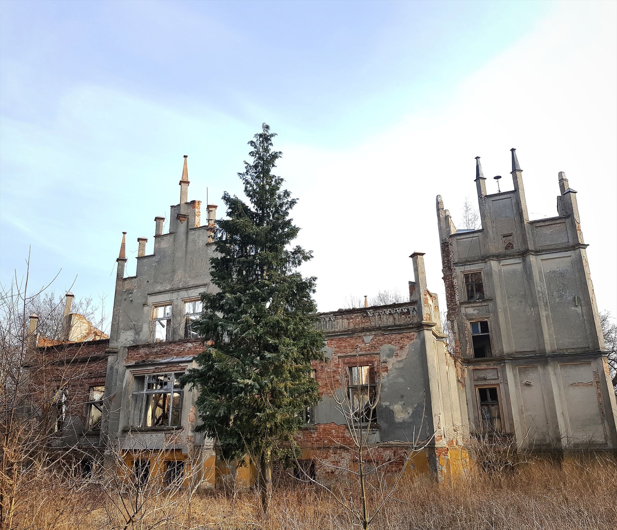 Ciekawostka - od zachodu pałac sąsiaduje z dziedzińcem gospodarczym. Wokół dziedzińca wybudowano w XIX w. oborę, wozownię i kuźnię z masztalernią. Z budynków gospodarczych wyróżnia się kuźnia z wieżą o konstrukcji szkieletowej. Od wschodu do rezydencji przylega niewielki park, którego początki sięgają XVIII w. Obecnie przeważają w nim nowsze nasadzenia, na uwagę zasługują pojedyncze okazy dębów, lip, jesionów, kasztanowców oraz aleja grabowa.
