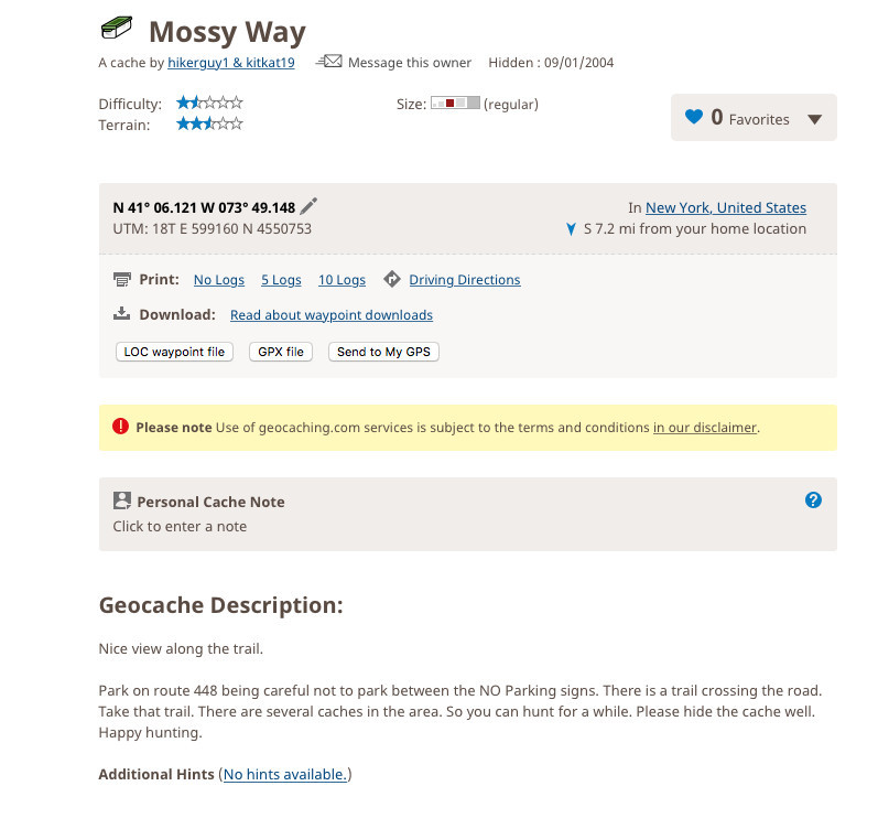 As some of you know, the cache owner, John Marcelina, known as hikerguy1 on geocaching.com, passed away. Hikerguy1 had 4 caches in Rockefeller State Park. Mossy Way was originally hidden on September 1, 2004 and had 141 finds during the 13 years it was in place.