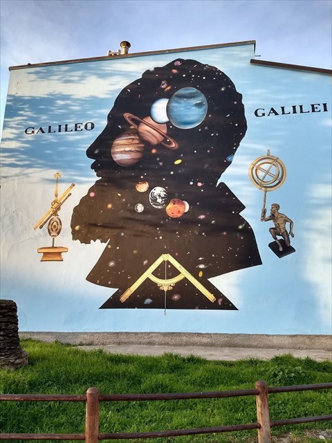 Ozmo, Pisan artist, completed this mural on the external wall of a private building, located in via Conte Fazio. What makes this fifth realization unique is the subject. An iconographic work dedicated to the Pisan scientist and astronomer Galileo Galilei. A great profile of the master is framed below by the instruments used for the study of the sky, among which the telescope perfected by the scientist. From the profile, moreover, emerge the night sky and the planets that Galileo has observed for many years, together with his principal discoveries (i.e. the four biggest Jupiter satellites, phases of the moon). The mural is a sort of medal - symbol of the city of Pisa and of its history as a pole for the study of science.