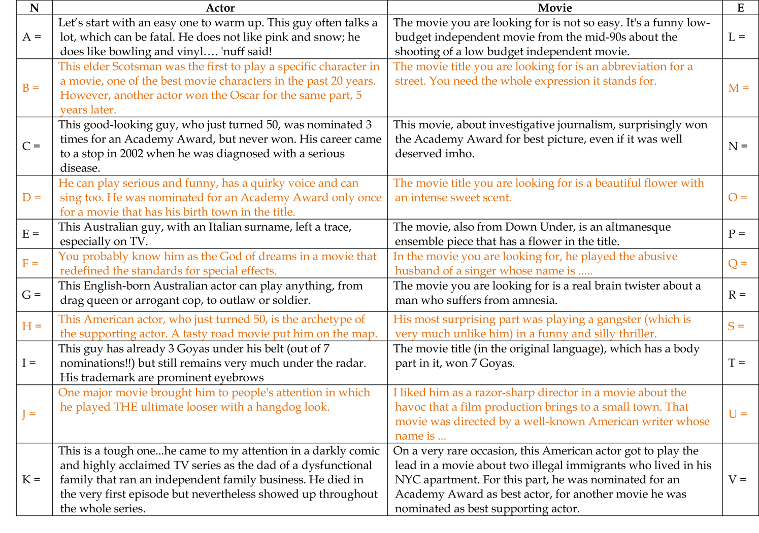 Your mission is twofold, find the name of the actor and the title of the movie he was in. Twice, instead of the movie title you need to find the name of a person related to that movie. You are always looking for the official stage name of the actor as it appears in the movie credits (some have a middle initial that you have to take into consideration too) and for the title of the movie in its ORIGINAL language. Then convert the names and movie titles to numbers (A=1, B=2, C=3 etc.).