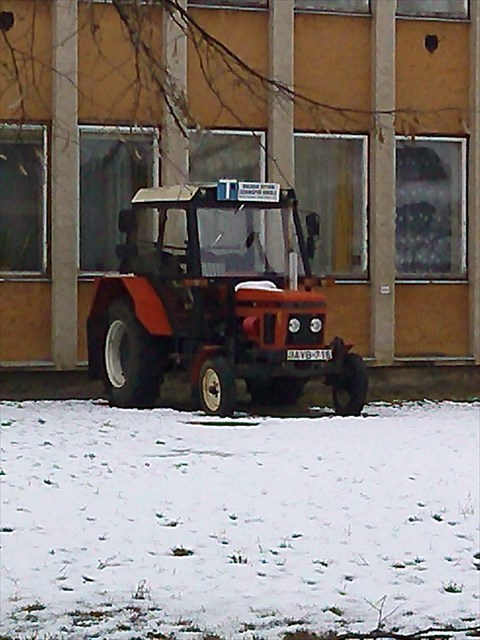 A Bocskai István Szakgimnázium épülete előtt láttam ezt az öreg traktort. A láda a kerítésen kívül van. de onnan is lehet látni a gépet.