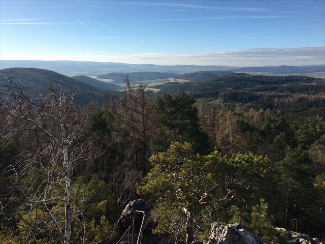 Z vrcholu skály je velmi působivý kruhový výhled. Jako zpestření vyhlídkové plošiny jsou ve skále umístěny kovové průzory, díky nimž je možné identifikovat jednotlivé vrcholy na obzoru. Spatřit lze například nedalekou Krušnou horu, Velíz či Točník.