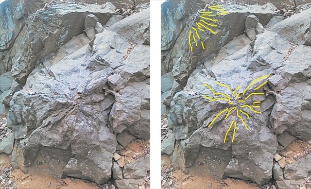 Another type of fracture observed in the diabase is a result of when the workers drilled into the rock and used explosives to push the rock apart. You can identify where the explosives were detonated by the "star-burst" pattern of the tightly-spaced, radiating fractures. If you look carefully you will see remnants of the drill borings that the explosives were placed in on some fracture sets.