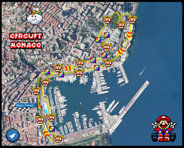 Cette wherigo est une simulation du jeu video Mario Kart sur le circuit mythique de Formule 1 de Monaco, dans l'esprit du retrogaming. Pour obtenir les coordonnées complètes de la geocache, il faut finir la course sur le podium.