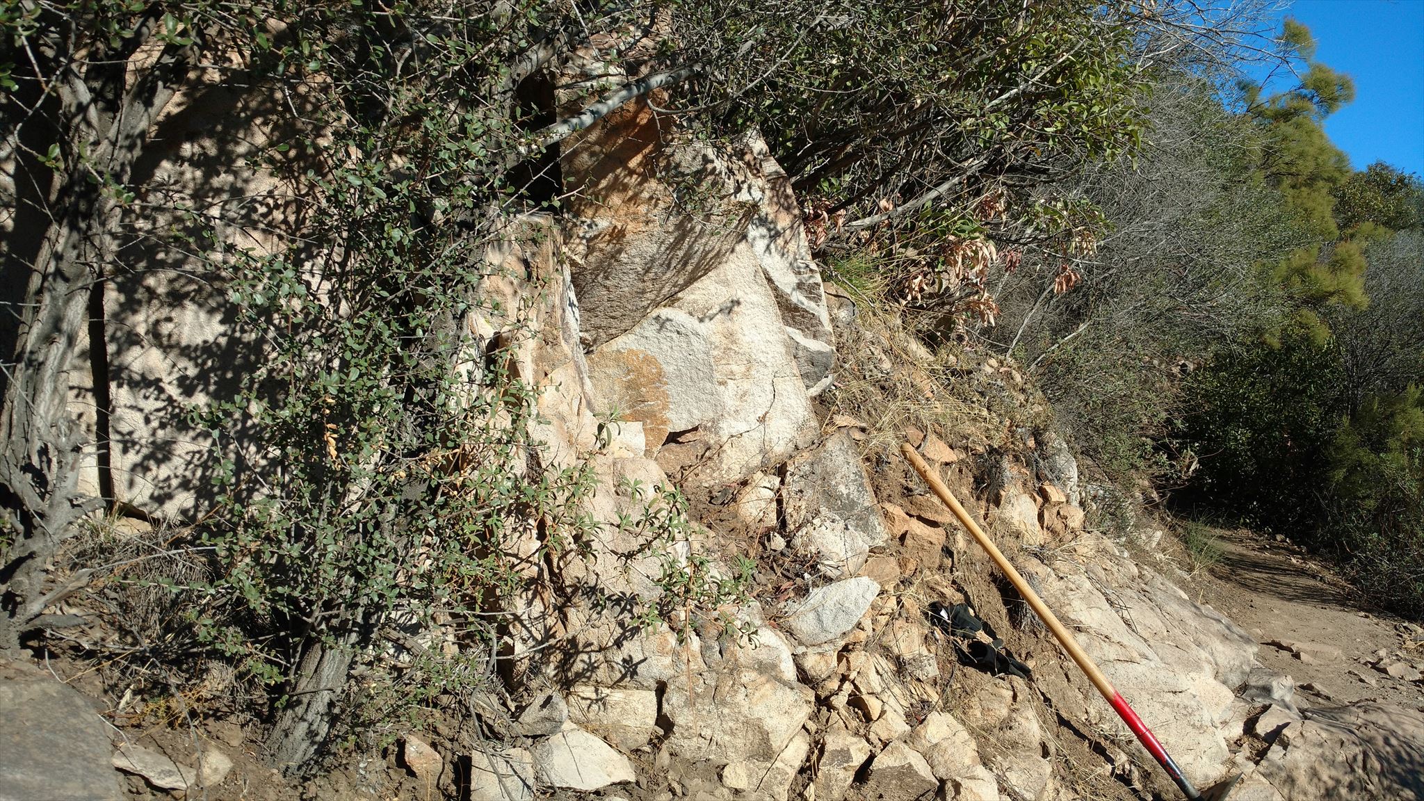 Cache is a ready to go Geocaching.com small Pelican container, with pencil, logbook, swag and a unregistered FTF trackable for FTF. It is hiding among the rocks, about 6 feet off the trail surface on a rock shelf behind a rock. Please replace so it's not visible from the trail. It's on the uphill side of the trail - since coordinates seem to be flaky (best I could do was within 22 feet), I have included a photo of the area you will encounter as you hike from the trailhead