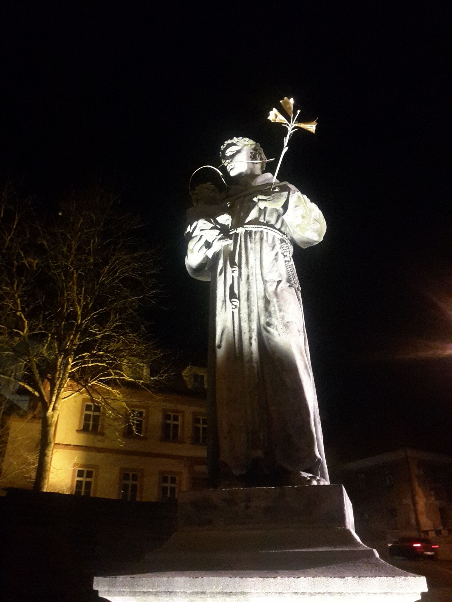 44. pozvánka k sakrální památce v našem regionu vám přiblíží sochu stojící při jednom ze vstupů do města. Socha sv. Antonína Paduánského byla usazena v rámci revitalizace historického jádra našeho města v místech zaniklé Pražské brány jako doplněk nově obnoveného mostu. A to je moc dobře, nejen protože ještě před pár lety by jste v centru a blízkém okolí Slaného o barokní kamennou skulpturu ve veřejném prostoru nezavadili. Trojiční a mariánský sloup z r. 1860 byl v roce 1920 stržen, pilíř se sochou Panny Marie z roku 1697, který stával na Pražském předměstí byl ve dvacátých letech 20.století přenesen na IV. slánský hřbitov a sochařská kolekce z období baroka (jejíž součástí byla i socha sv Antonína Paduánského), která stála v aleji před klášterem byla přenesena v roce 1891 do areálu kláštera. Aktuálně jsou v aleji před klášterem instalovány 3 z pěti těchto soch. Prohlédnout si je můžete třeba při odlovu KOSTEL NEJSVETEJSI TROJICE S KLASTEREM. Sv. Antonín pak, jak je zjevné, byl po restaurátorských pracech umístěn právě do míst zaniklé Pražské brány.