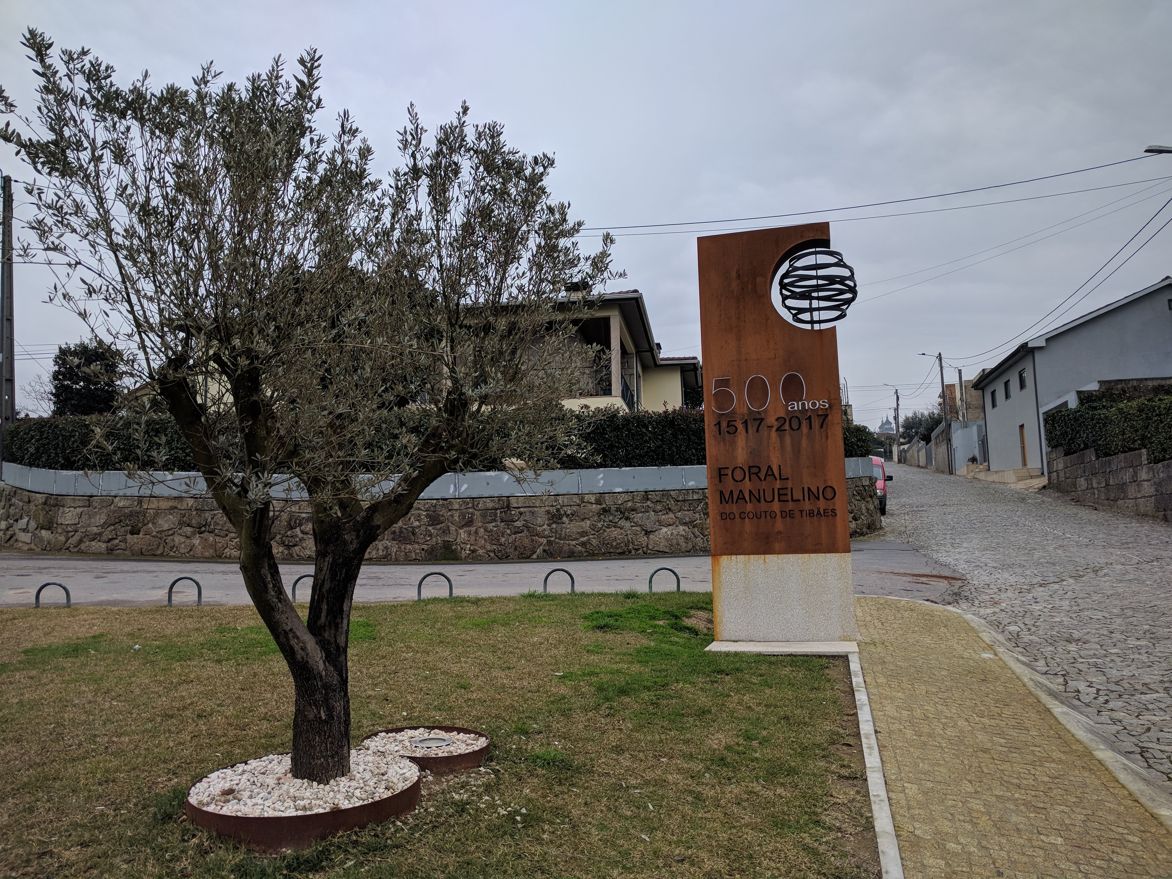 Da autoria da arquiteta Fátima Pereira, o monumento inaugurado pretende perpetuar, de forma física, a memória e o património histórico da freguesia de Mire de Tibães, traduzindo a história dos 500 anos da atribuição da Carta do Foral a Tibães. O monumento transformar-se-á, ao longo do tempo, nomeadamente sob a sua cor e aspeto, mutante, com o passar dos anos, face às condições climatéricas a que está submetido, ganhando uma patine de zinco, que o tornará, ao longo do tempo, mais nobre e atrativo, representando meio milénio de importância de Mire de Tibães na história de Braga, da região e do país. [1]