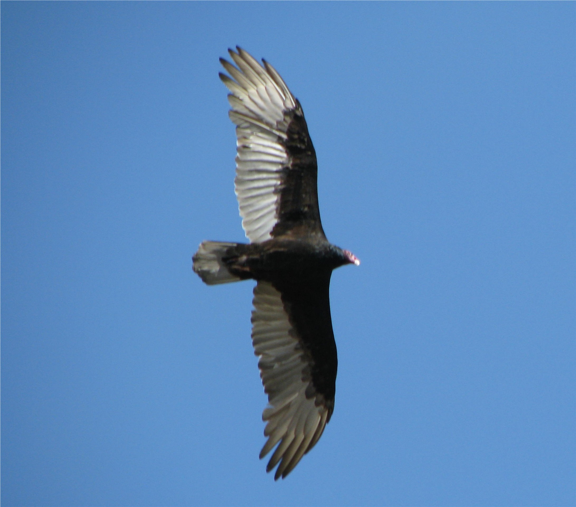 Turkey Vultures are very large, raptor-like birds that scavenge on dead animals. They are often seen soaring about, sometimes in groups. They are distinguished by the black and white wing pattern on the underside and by their holding their wings in a V as they soar.
