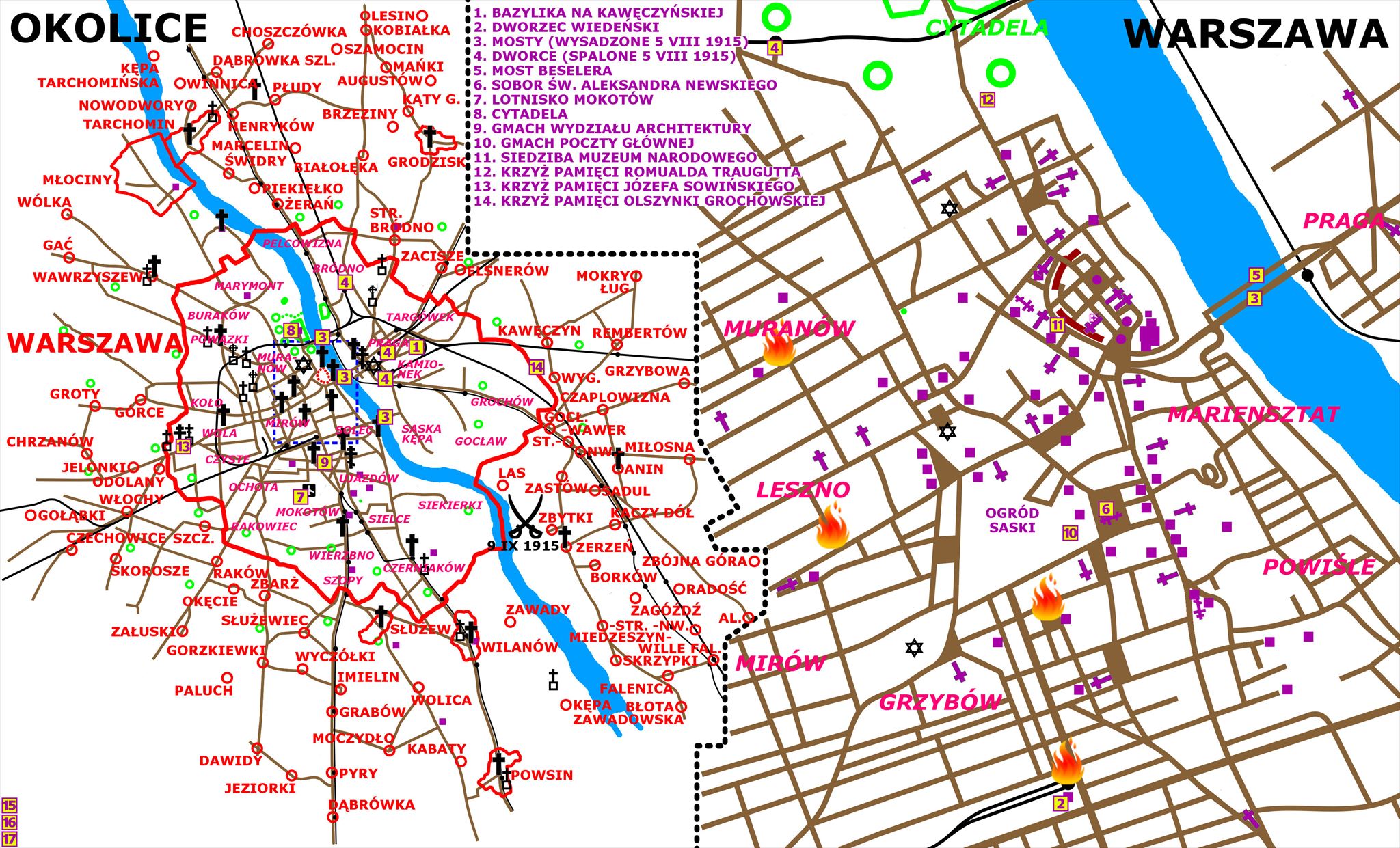 On 1 August 1914 Germany declared war on Russia, that's when the First World War started for the citizens of Warsaw. The Central Civic Committee was created almost immediately to register the war losses and administering in war zones, and Russian were calling for a fight against Germans in the name of the Slavic unity. The Polish National Committee of Roman Dmowski was formed in Warsaw, but most of the military organizations were centred around Kraków. The outbreak of the war stopped a number of investments, including the construction of the church at Kawęczyńska St. or the regulation plan of Młociny, there were difficulties with supply and demand, because the "voracious" Russian garrisons had left the city. Meanwhile, the initiative was taken by Germans, who started to bombard the city from the zeppelins – at least six times in a few months, damaging places like the Vienna Station or the monument of the loyal Polish officers at Zielony Square. The advances of German troops in the first half of 1915 caused that on 5 August the Russians evacuated from Warsaw, but before that they burned down several railway stations – Petersburg, Terespol, Praga and Kowel – they removed a large part of the rolling stock from the short-distance railways and the machinery park from the factories and finally they blew all three bridges – Mikołajewski, Kierbedzia and at the Citadel in turn. A few hours later the German cavalry entered the city, Hans von Beseler took the post of the Governor-General and the Civic Committee appointed the Board of the City Hall. The Germans ordered a de-Russification of the city – the Russian-named streets was changed, like Friedrich von Berg was replaced by Romuald Traugutt (1916) – they led to restart the trams and short-distance railways, created field hospitals and closed the Orthodox churches, but the Orthodox Cathedral of St. Aleksander Nevsky was transformed into an Evangelical Garrison Church. A temporary Beselera-Bridge was built on the Vistula, a huge airship-hall was constructed at the Mokotów Airport and a radio station was opened on the Citadel to maintain communication with the Headquarters in Liège, but in the meanwhile they confiscated the remaining equipment of the factories. However, wanting to buy into favors, they allowed the opening of the University of Warsaw and the Warsaw University of Technology – the Faculty of Architecture took over the building of the Russian Municipal Gymnasium at Koszykowa Street – dismantling the Russian monuments and setting the commemorative crosses at the death sites of Józef Sowiński or Romuald Traugutt and at Olszynka Grochowska. Some Catholic Orders were allowed to return to their churches and all bridges were temporarily reconstructed within the year, but the Kierbedzia Bridge was rebuilt in a diffrent shape than originally. A new building of the Main Post Office was opened at Warecki Sq. and the National Museum was founded at Podwale Street. However, the most important decision was made on 8 April 1916, when Warsaw was extended with several towns nearby, like Bródno, Grochów, Marymont, Mokotów, Powązki, Wola and many others, increasing the city's area many times. In order to finally convince Polish people to support the German forces, the authorities issued the Act of 5 November – promising the creation of an autonomous Kingdom of Poland.