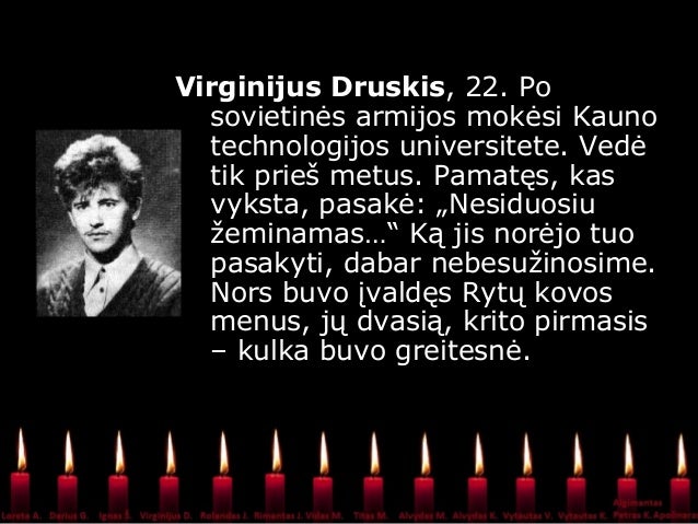 - 10. Virginijus Druskis,. Po sovietinės armijos mokėsi Kauno technologijos universitete. Vedė tik prieš metus. Pamatęs, kas vyksta, pasakė: „Nesiduosiu žeminamas…“ Ką jis norėjo tuo pasakyti, dabar nebesužinosime. Nors buvo įvaldęs Rytų kovos menus, jų dvasią, krito pirmasis – kulka buvo greitesnė.