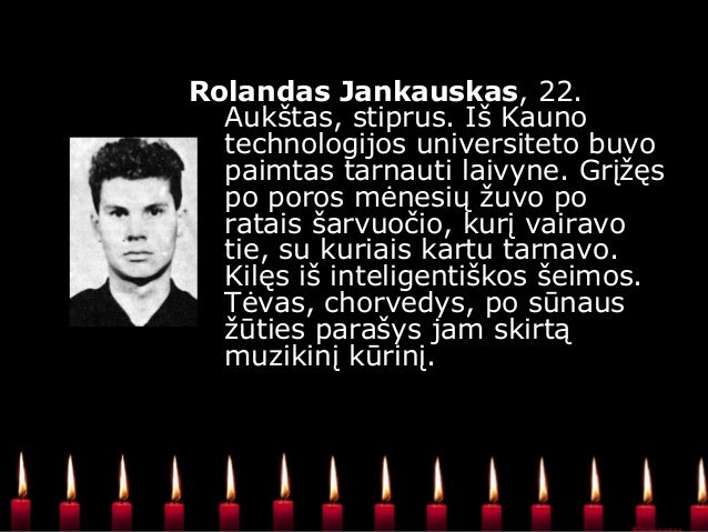 - 11. Rolandas Jankauskas. Aukštas, stiprus. Iš Kauno technologijos universiteto buvo paimtas tarnauti laivyne. Grįžęs po poros mėnesių žuvo po ratais šarvuočio, kurį vairavo tie, su kuriais kartu tarnavo. Kilęs iš inteligentiškos šeimos. Tėvas, chorvedys, po sūnaus žūties parašys jam skirtą muzikinį kūrinį.