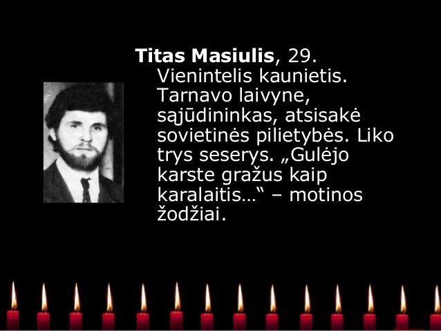 - 14. Titas Masiulis. Vienintelis kaunietis. Tarnavo laivyne, sąjūdininkas, atsisakė sovietinės pilietybės. Liko trys seserys. „Gulėjo karste gražus kaip karalaitis…“ – motinos žodžiai.