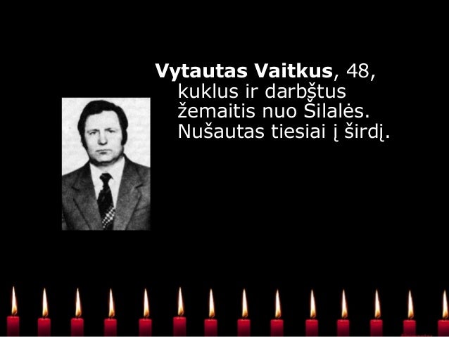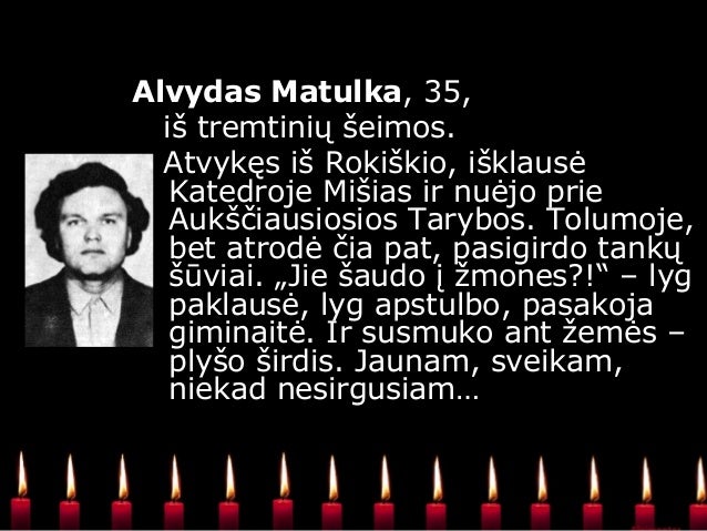 - 19. Alvydas Matulka, iš tremtinių šeimos. Atvykęs iš Rokiškio, išklausė Katedroje Mišias ir nuėjo prie Aukščiausiosios Tarybos. Tolumoje, bet atrodė čia pat, pasigirdo tankų šūviai. „Jie šaudo į žmones?!“ – lyg paklausė, lyg apstulbo, pasakoja giminaitė. Ir susmuko ant žemės – plyšo širdis. Jaunam, sveikam, niekad nesirgusiam…
