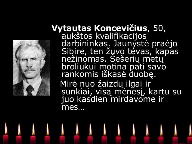 - 16. Vytautas Koncevičius, aukštos kvalifikacijos darbininkas. Jaunystė praėjo Sibire, ten žuvo tėvas, kapas nežinomas. Šešerių metų broliukui motina pati savo rankomis iškasė duobę. Mirė nuo žaizdų ilgai ir sunkiai, visą mėnesį, kartu su juo kasdien mirdavome ir mes…