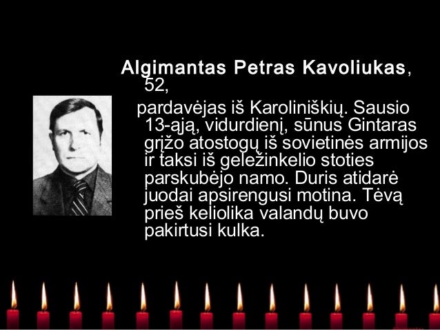- 17. Algimantas Petras Kavoliukas, pardavėjas iš Karoliniškių. Sausio 13-ąją, vidurdienį, sūnus Gintaras grįžo atostogų iš sovietinės armijos ir taksi iš geležinkelio stoties parskubėjo namo. Duris atidarė juodai apsirengusi motina. Tėvą prieš keliolika valandų buvo pakirtusi kulka.