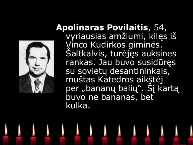 - 18. Apolinaras Povilaitis, vyriausias amžiumi, kilęs iš Vinco Kudirkos giminės. Šaltkalvis, turėjęs auksines rankas. Jau buvo susidūręs su sovietų desantininkais, muštas Katedros aikštėj per „bananų balių“. Šį kartą buvo ne bananas, bet kulka.