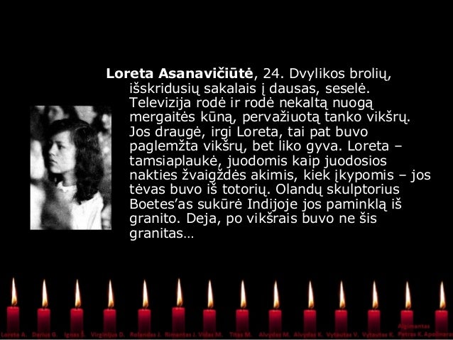 - 7. Loreta Asanavičiūtė, 24. Dvylikos brolių, išskridusių sakalais į dausas, seselė. Televizija rodė ir rodė nekaltą nuogą mergaitės kūną, pervažiuotą tanko vikšrų. Jos draugė, irgi Loreta, tai pat buvo paglemžta vikšrų, bet liko gyva. Loreta – tamsiaplaukė, juodomis kaip juodosios nakties žvaigždės akimis, kiek įkypomis – jos tėvas buvo iš totorių. Olandų skulptorius Boetes’as sukūrė Indijoje jos paminklą iš granito. Deja, po vikšrais buvo ne šis granitas…