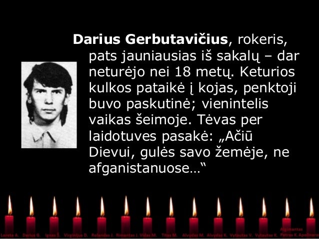 - 8. Darius Gerbutavičius, rokeris, pats jauniausias iš sakalų – dar neturėjo nei 18 metų. Keturios kulkos pataikė į kojas, penktoji buvo paskutinė; vienintelis vaikas šeimoje. Tėvas per laidotuves pasakė: „Ačiū Dievui, gulės savo žemėje, ne afganistanuose…“