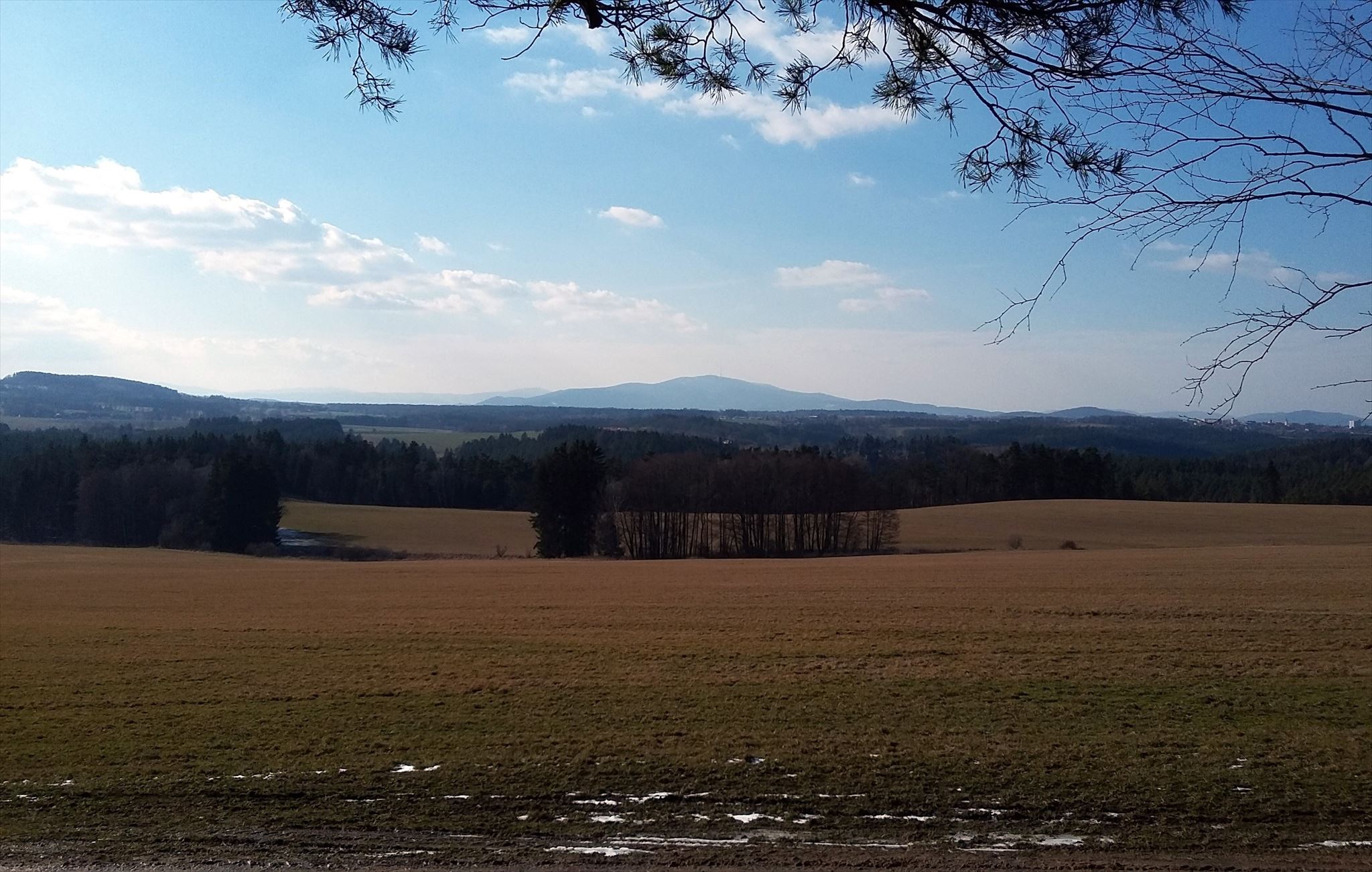 Co by kamenem dohodil od Chlumské hory, která je kolem dokola ověšená různými T5 výhledy, je jedno místo, odkud je krásný výhled do kraje i ze země (terén maximálně T2). Za pěkného počasí je odtud výhled nejen na Kleť (vzdálenou odtud cca 18 km na západo-severozápad), ale také na Polušku nebo třeba na Velešín.