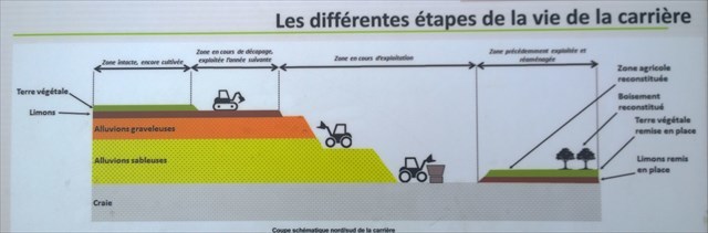 La carrière de Muids-Daubeuf est exploitée par Lafarge Granulats. Les coordonnées en-tête du descriptif vous amènent à un belvédère surplombant le site d'extraction. Un panneau d'information vous fournit toutes les explications dont voici un extrait :