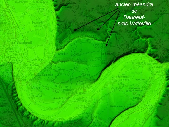 Ces alluvions ont été déposées lors des glaciations à une époque où la courbure du méandre de Muids-Daubeuf était inversée. La trace est bien visible dans la topographie du site.