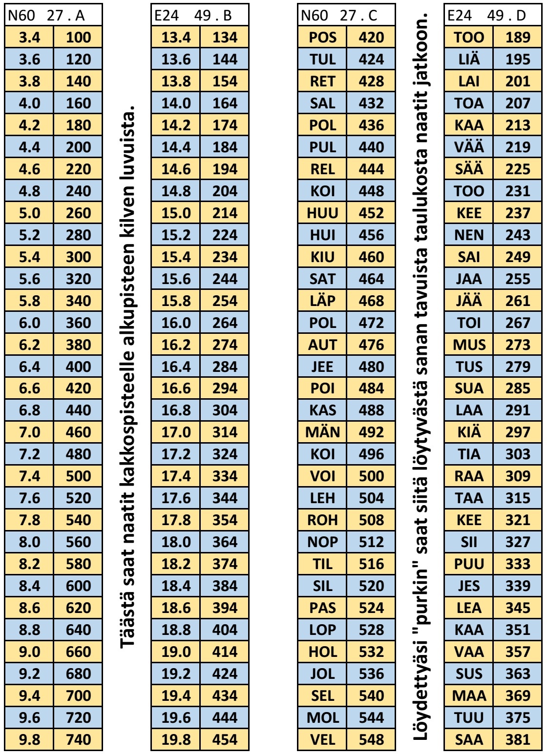 Löydät alkupisteeltä kilven. Kilvestä löydät lukuja. Alla olevasta taulukosta saat naatit seuraavalle pisteelle, kun sijoitan kilvestä löydetyt luvut siihen.