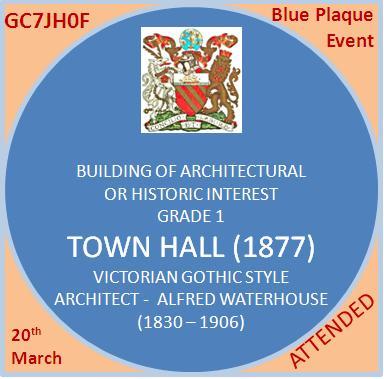 This Blue Place celebrates Manchester Town Hall which was designed by architect Alfred Waterhouse, the town hall was completed in 1877. The building contains offices and grand ceremonial rooms such as the Great Hall which is decorated with Ford Madox Brown's imposing Manchester Murals illustrating the history of the city. The entrance and Sculpture Hall contain busts and statues of influential figures including Dalton, Joule and Barbirolli. The exterior is dominated by the clock tower which rises to 280 feet (85 m) and houses Great Abel, the clock bell.