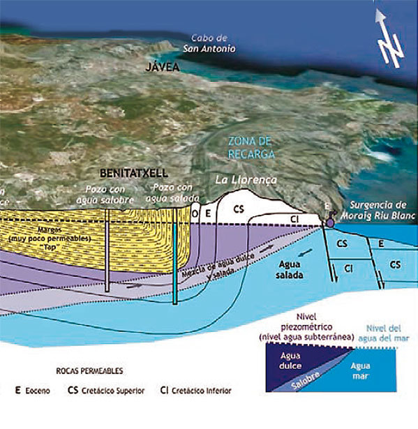 Los caminos por los que circula el agua marina no son conocidos, pero las observaciones realizadas conducen a considerar que el agua se introduce por el sumidero de la Cova dels Coloms, en el Morro de Toix (situado entre Altea y Calp), atraviesa el sistema acuífero de la depresión de Benissa a través de aproximadamente 20 km de conductos cársticos, y resurge por la surgencia submarina del Moraig, en el Poble Nou de Benitatxell.